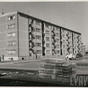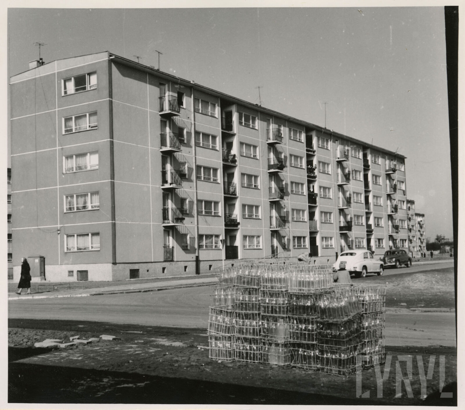 Blok mieszkalny przy ul. Grochowskiej między ulicami Świerczewskiego (dzisiaj Bukowska) i Świt, na słupach flagi powieszone z okazji zbliżającego się Narodowego Święta Odrodzenia Polski i 30-lecia PRL16.07.1974