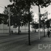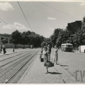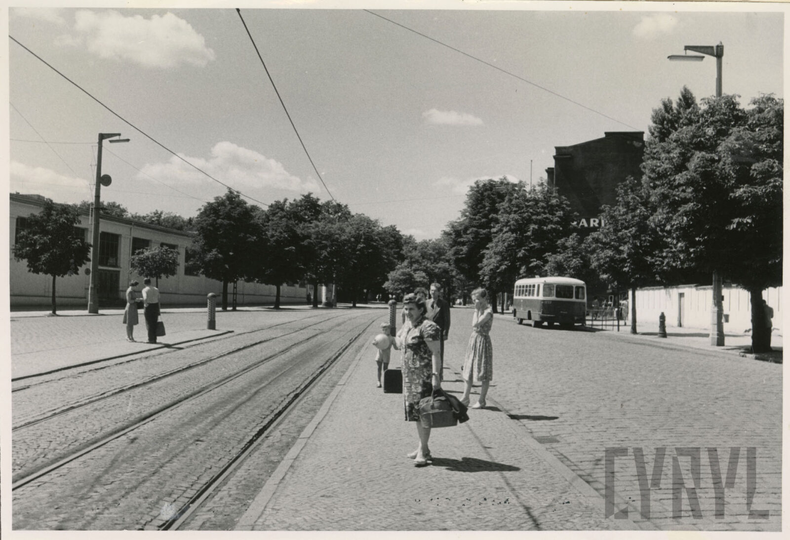 Skrzyżowanie ulic Roosevelta i Świerczewskiego (dzisiaj Bukowska), w głębi pawilony Międzynarodowych Targów Poznańskich, po prawej fragment budynku z kinem Bałtyk (nie istnieje)07.1962
