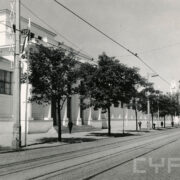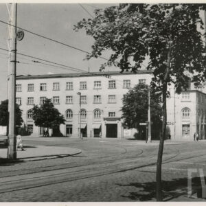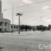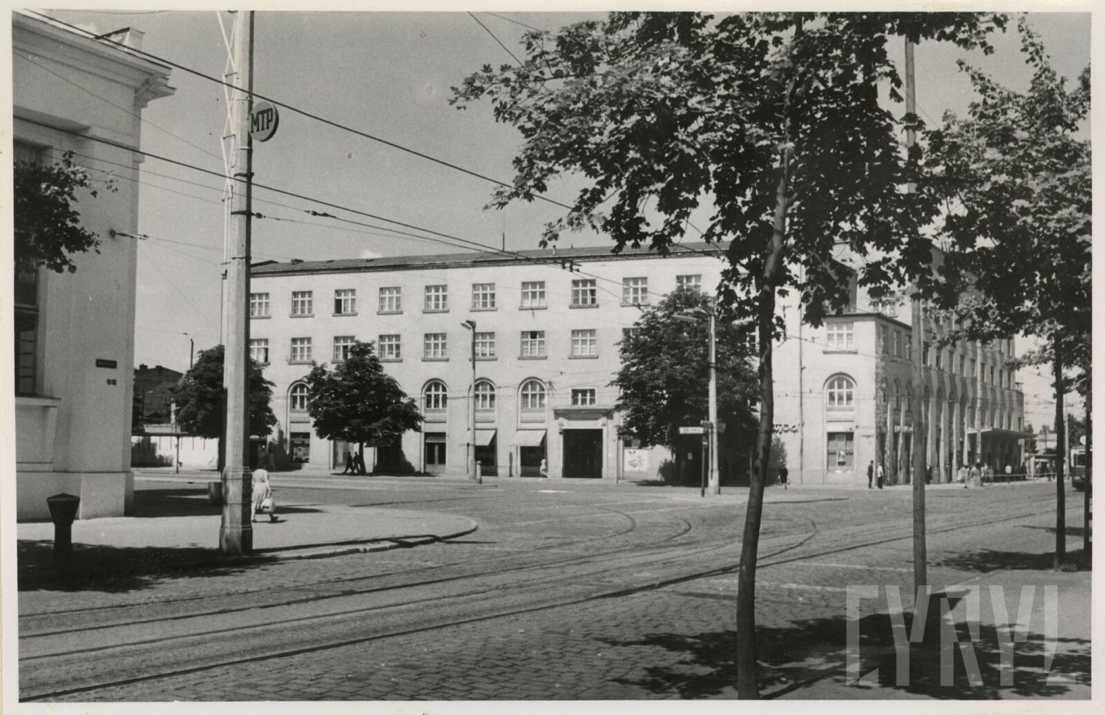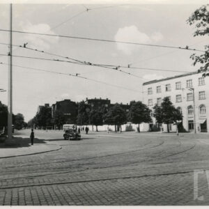 Skrzyżowanie ulic Roosevelta i Świerczewskiego (wcześniej i obecnie ul. Bukowska), po lewej fragment Pałacu Targowego, w głębi budynek mieszkalny z kinem Bałtyk (nieistniejący)07.1962