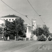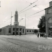 Skrzyżowanie ulic Roosevelta i Świerczewskiego (wcześniej i obecnie ul. Bukowska), po lewej fragment Pałacu Targowego, po prawej budynek mieszkalny z kinem Bałtyk (nieistniejący)07.1962