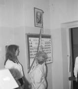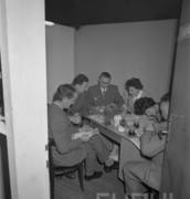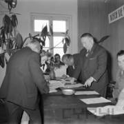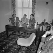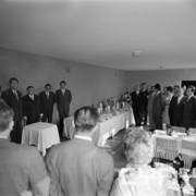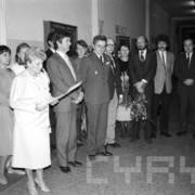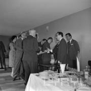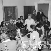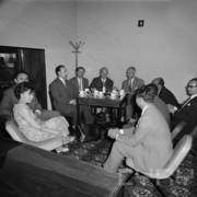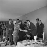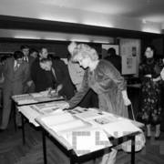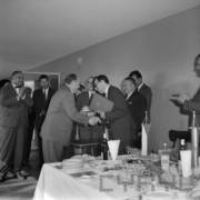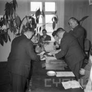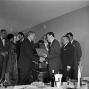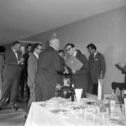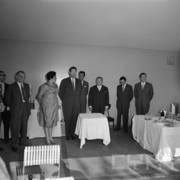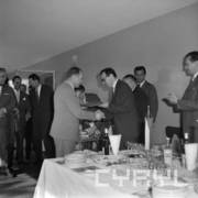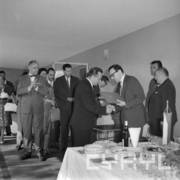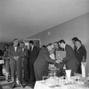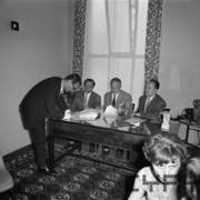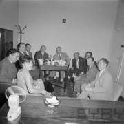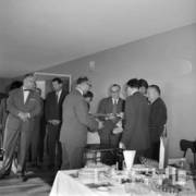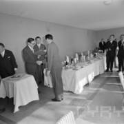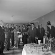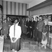 Jedna z delegacji z I sekretarzem KW PZPR w Poznaniu Janem Szydlakiem (czwarty od prawej) na czele w antresoli pawilonu nr 2 w czasie Targów Krajowych Jesień 1962