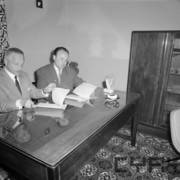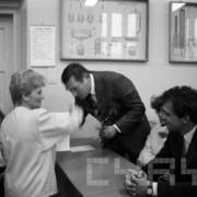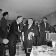 Przywitanie wicepremiera Eugeniusz Szyra (w środku) przez dyrektora MTP Stefana Askanasa (z lewej) w czasie Targów Krajowych Jesień 1962