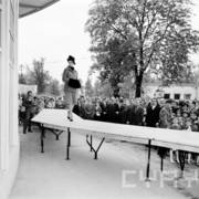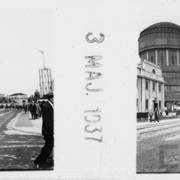 Aleksander Amerla (poznański trębacz i znajomy Stefana Bolesława Poradowskiego) przed Wieżą Górnośląską w czasie XVI Targów Poznańskich
