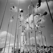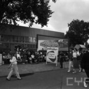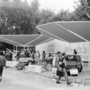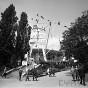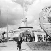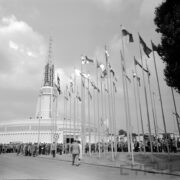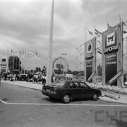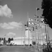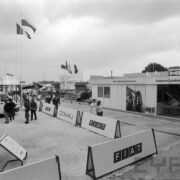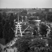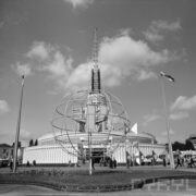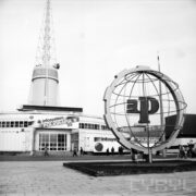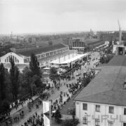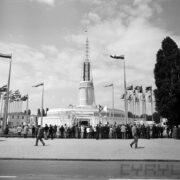 Teren wokół pawilonu nr 13, tzw. Parasola (z prawej), w czasie XXXVIII Międzynarodowych Targów Poznańskich, w głębi Iglica (pawilon nr 11)08.06.1969–17.06.1969