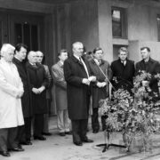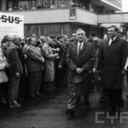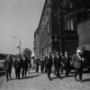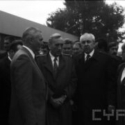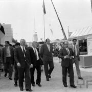 Delegacja rządowa z ministrem handlu zagranicznego Januszem Burakiewiczem (trzeci z prawej) w czasie otwarcia XXXVIII Międzynarodowych Targów Poznańskich, z prawej w głębi pawilon nr 11 tzw. Iglica08.06.1969