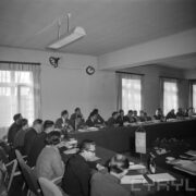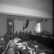 Prezes MTP Stanisław Laskowski, pierwszy od prawej, przewodniczący spotkaniu roboczemu w czasie 61. Międzynarodowych Targach Poznańskich (?)11.06.1989–18.06.1989