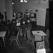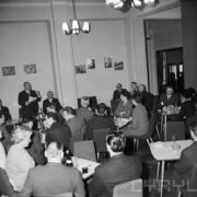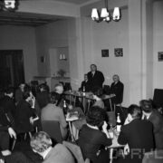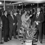 Delegacja rządowa z ministrem handlu zagranicznego Januszem Burakiewiczem (trzeci od prawej) degustuje brazylijską kawę na otwarciu XXXVIII Międzynarodowych Targów Poznańskich08.06.1969