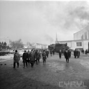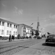 Droga z bocznicą kolejową przy pawilonie nr 12 (z lewej) w czasie XXXVIII Międzynarodowych Targów Poznańskich, w głębi po lewej Iglica (pawilon nr 11)08.06.1969–17.06.1969