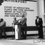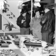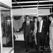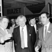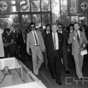 Przemówienie prezesa MTP Stanisława Laskowskiego w czasie targów branżowych Poligrafia'89 i Infosystem'89 (?), drugi od lewej stoi prezydent Poznania Andrzej Wituski10.04.1989–14.04.1989