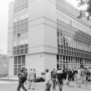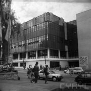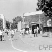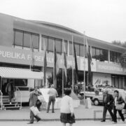Tereny targowe w czasie XXIII Targów Krajowych Wiosna 1969, z prawej pawilon nr 14 (nieistniejący), za nim pawilon nr 15 (wieżowiec, nie istnieje)16.03.1969–23.03.1969