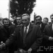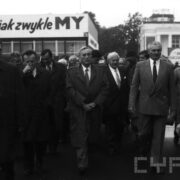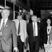 Delegacja rządowa na 61. Międzynarodowych Targach Poznańskich, w pierwszym rzędzie idą: minister Dominik Jastrzębski (pierwszy od prawej), premier Mieczysław Rakowski (drugi od prawej) i prezes MTP Stanisław Laskowski (trzeci od prawej)11.06.1989–18.06.1989
