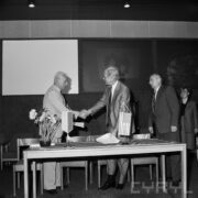 Delegacja rządowa z ministrem handlu zagranicznego Januszem Burakiewiczem (w pierwszym rzędzie, trzeci od prawej) na otwarciu XXXVIII Międzynarodowych Targów Poznańskich08.06.1969