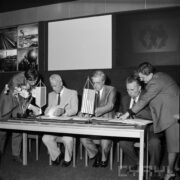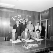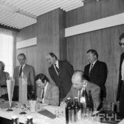 Prezes MTP Stanisław Laskowski (w środku) w czasie podpisywania jednej z umów o współpracy w czasie 61. Międzynarodowych Targach Poznańskich (?)11.06.1989–18.06.1989