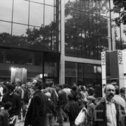 Otwarcie 61. Międzynarodowych Targów Poznańskich, w pierwszym rzędzie stoją m.in. prezes MTP Stanisław Laskowski (trzeci od lewej) oraz premier Mieczysław Rakowski (czwarty od lewej), w tle pawilon nr 14b (dawniej nr 28, dzisiaj nr 14)11.06.1989–18.06.1989