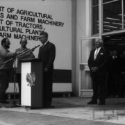 Przemówienie Dominika Jastrzębskiego, ministra współpracy gospodarczej z zagranicą, w czasie otwarcia 61. Międzynarodowych Targów Poznańskich, pierwszy z prawej prezydent Poznania Andrzej Wituski11.06.1989–18.06.1989