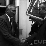 Delegacja rządowa z ministrem handlu zagranicznego Januszem Burakiewiczem (drugi z lewej) w pawilonie Grecji w czasie otwarcia XXXVIII Międzynarodowych Targów Poznańskich08.06.1969