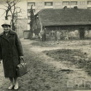 Irena Firyn na ul. Chociszewskiego niedaleko skrzyżowania z ul. Głogowską, w głębi nieistniejący dom ze spadzistym dachem, dalej nowy blok mieszkalny przy ul. Głogowskiej