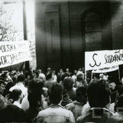 Uczestnicy demonstracji antykomunistycznej zorganizowanej przez opozycję w czasie pochodu pierwszomajowego przed kościołem Matki Boskiej Bolesnej w Poznaniu