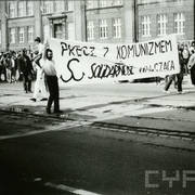 Uczestnicy demonstracji antykomunistycznej zorganizowanej przez opozycję w czasie pochodu pierwszomajowego na ul. Głogowskiej