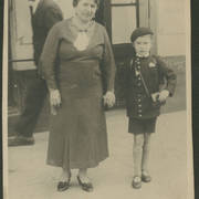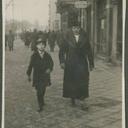 Tekla Dudek z Antonim Czarkowskim przed sklepem obuwniczym Dudków przy ul. Focha 69 (dzisiaj ul. Głogowska) w pierwszy dzień szkoły Antka