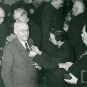 Weterani powstania wielkopolskiego w czasie uroczystości wodowania statku "Powstaniec Wielkopolski" w Ośrodku Kadłubowym Wulkan, w środku Maria Olszewska, uczestniczka powstania wielkopolskiego, matka chrzestna statku26.06.1974