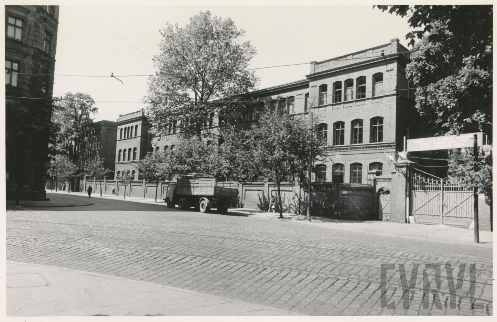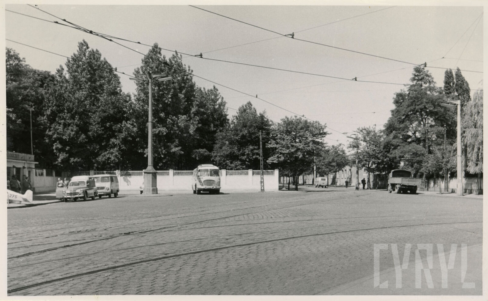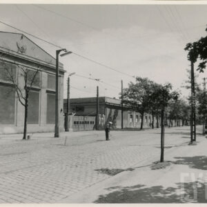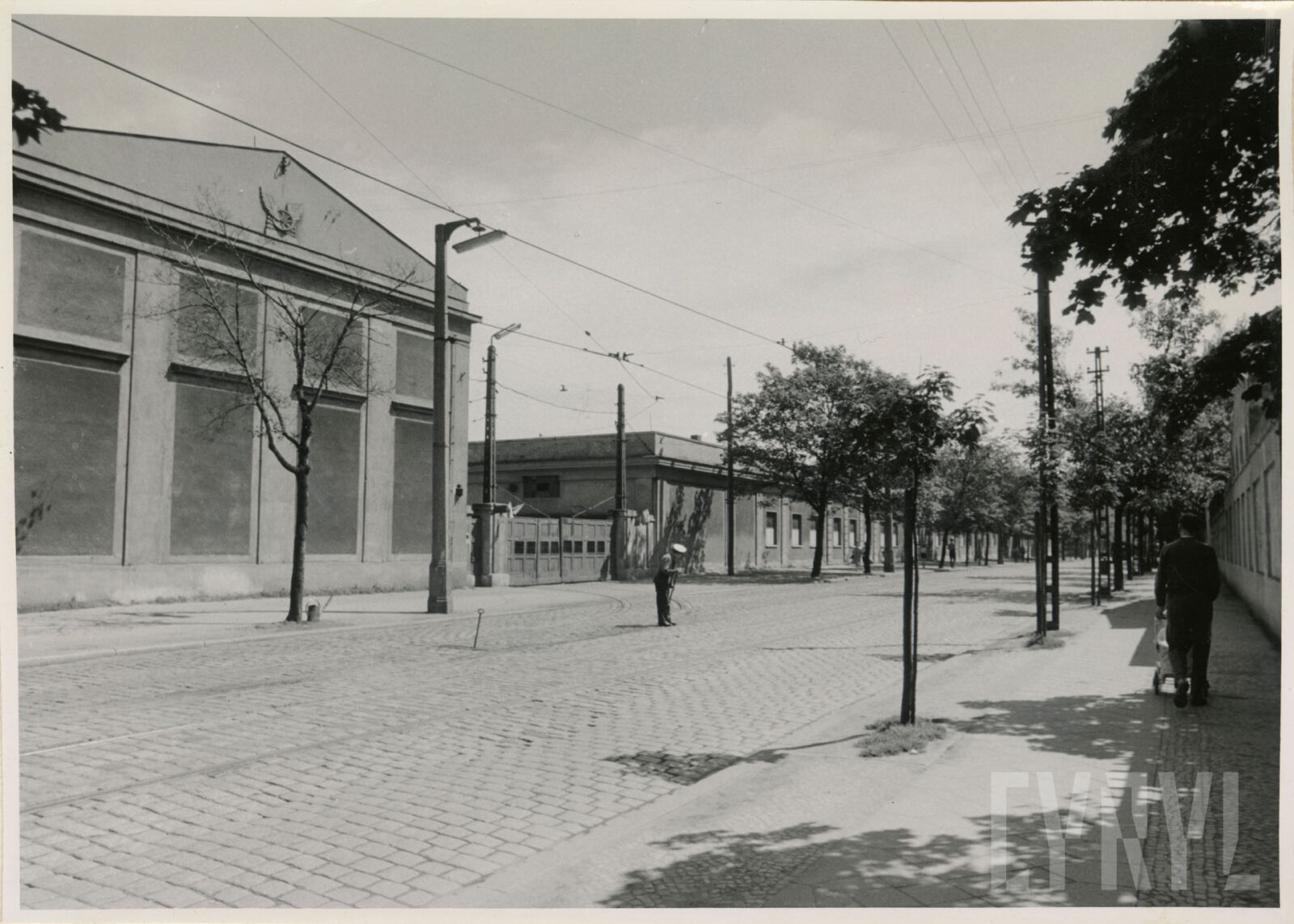 Ulica Zwierzyniecka, po lewej i w głębi hale zajezdni tramwajowej