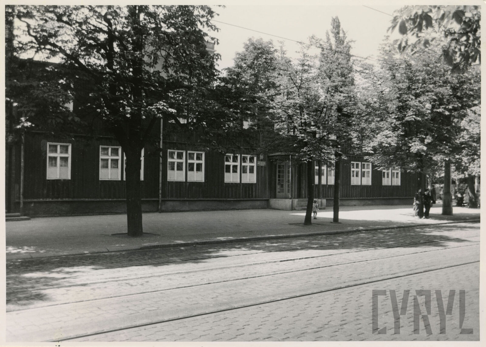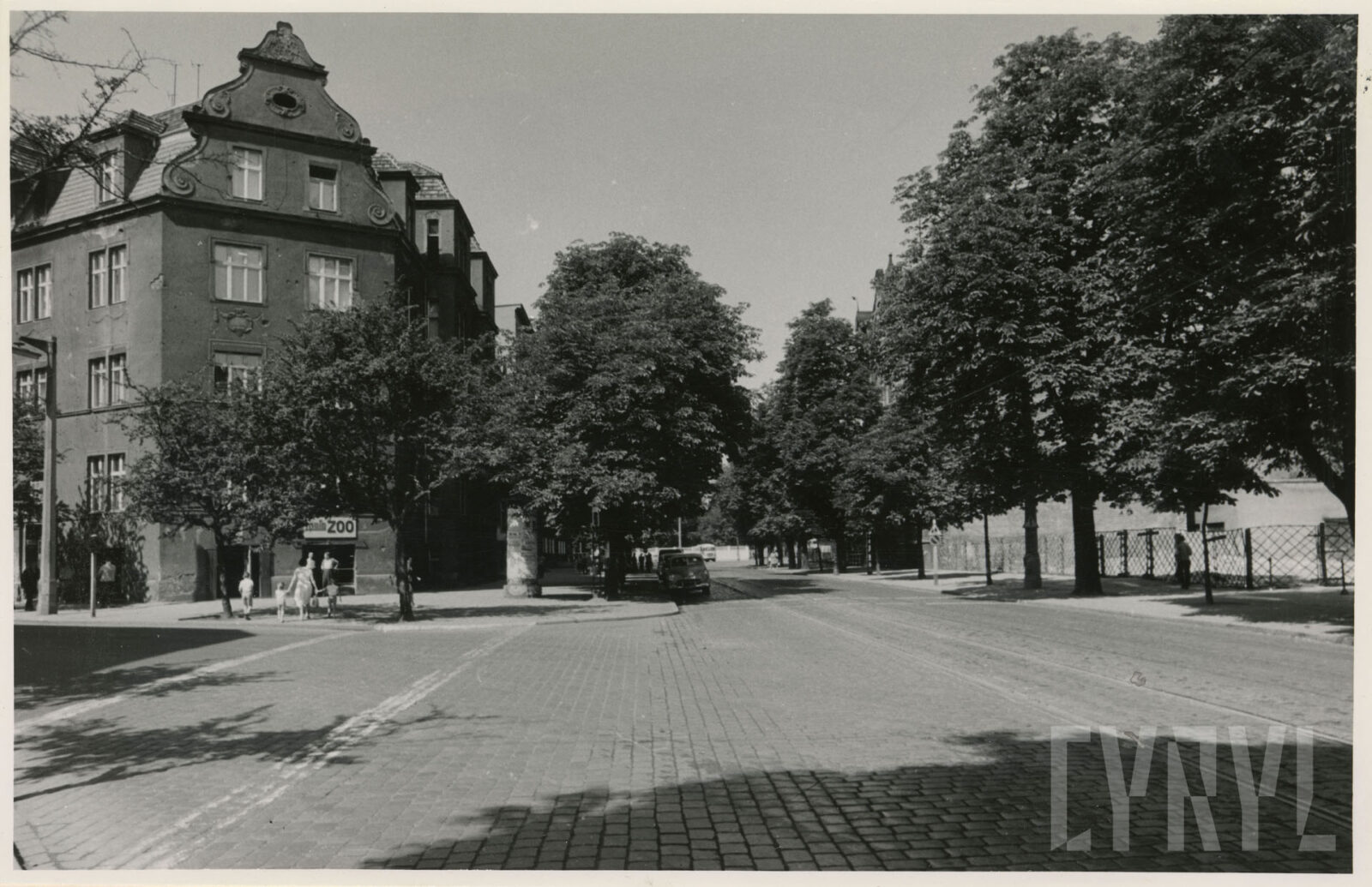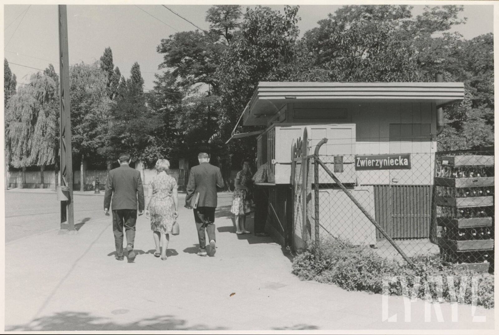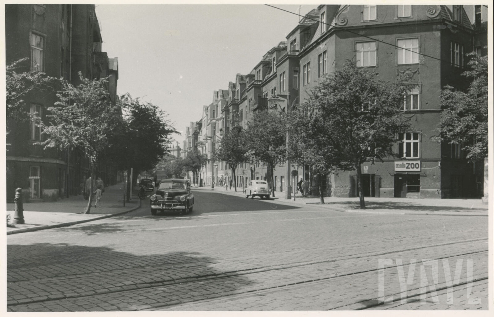 Ulica Zwierzyniecka, od lewej ogrodzenie ogrodu Zoologicznego, dalej szachulcowy budynek dawnego dworca kolejowego z 1848 roku na Jeżycach (Kolei Stargardzkiej; nie istnieje)