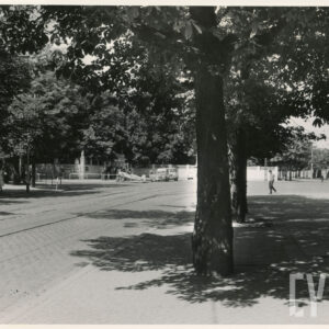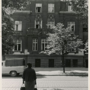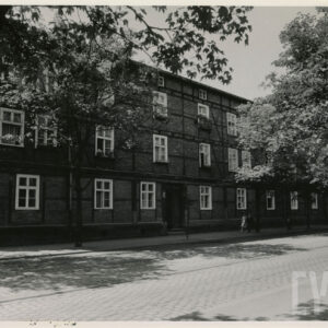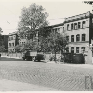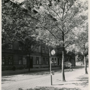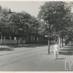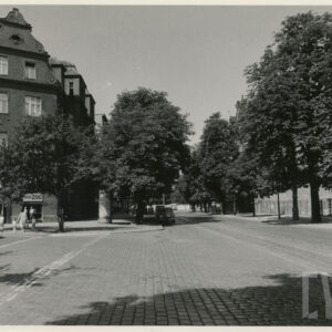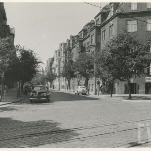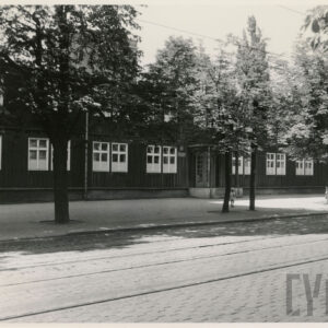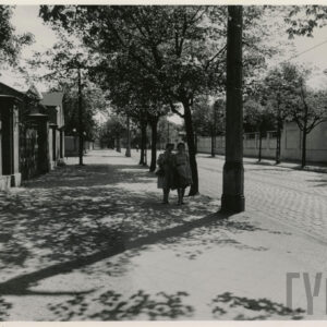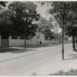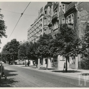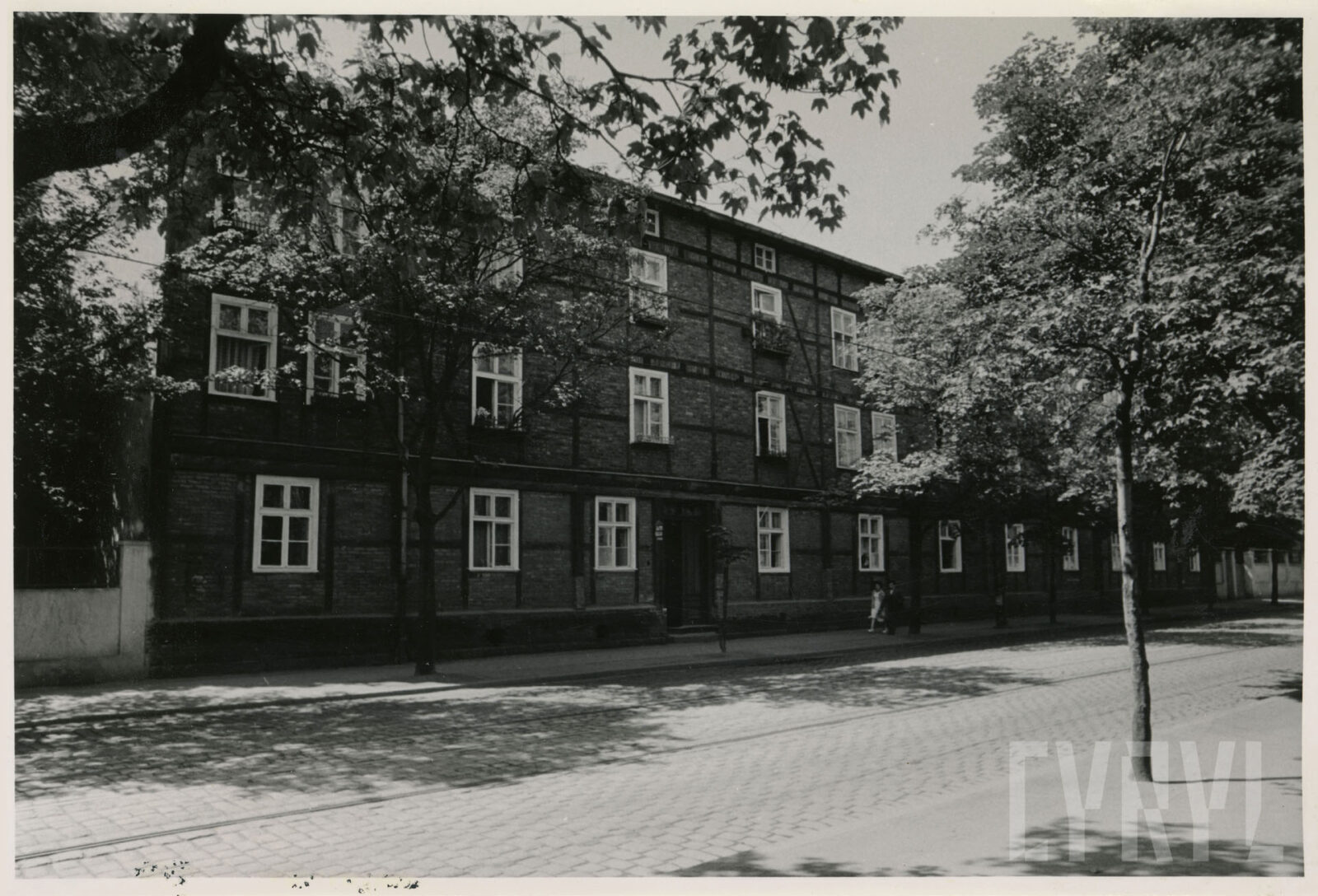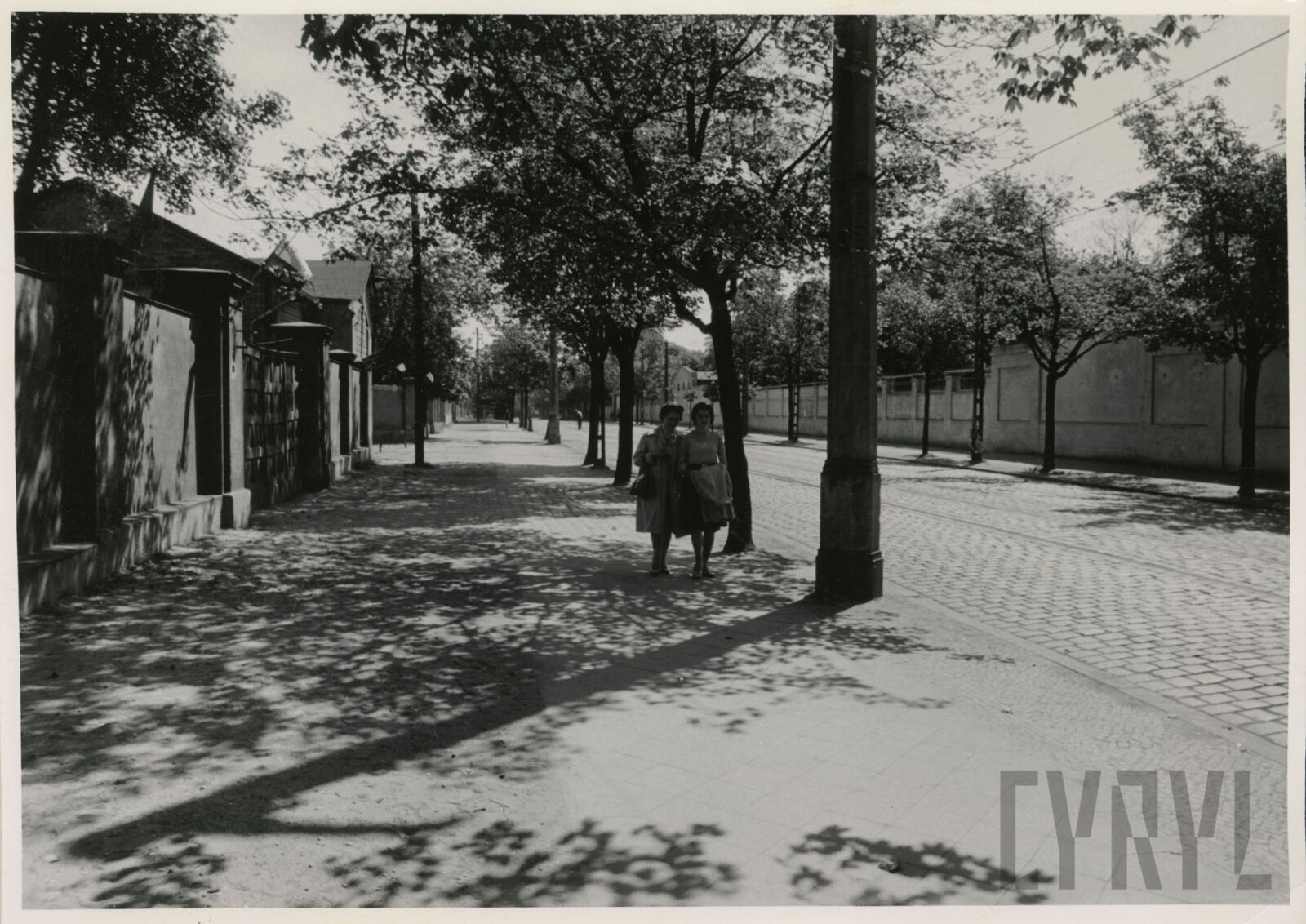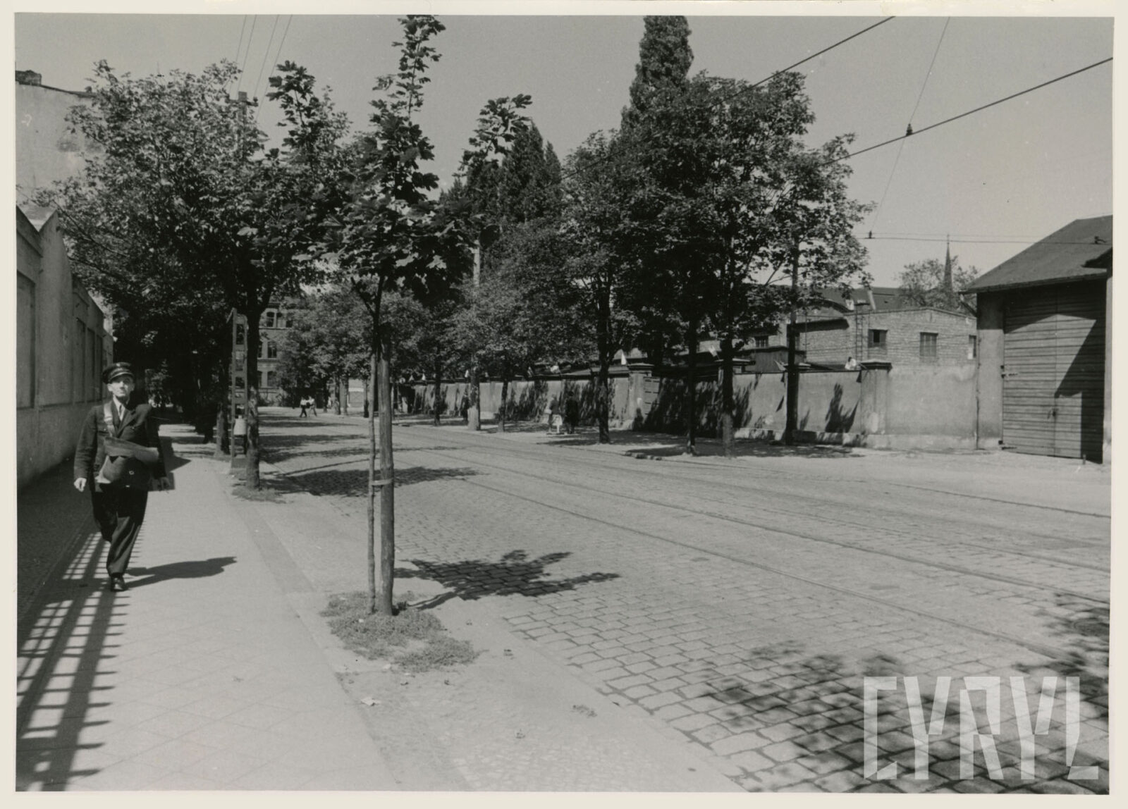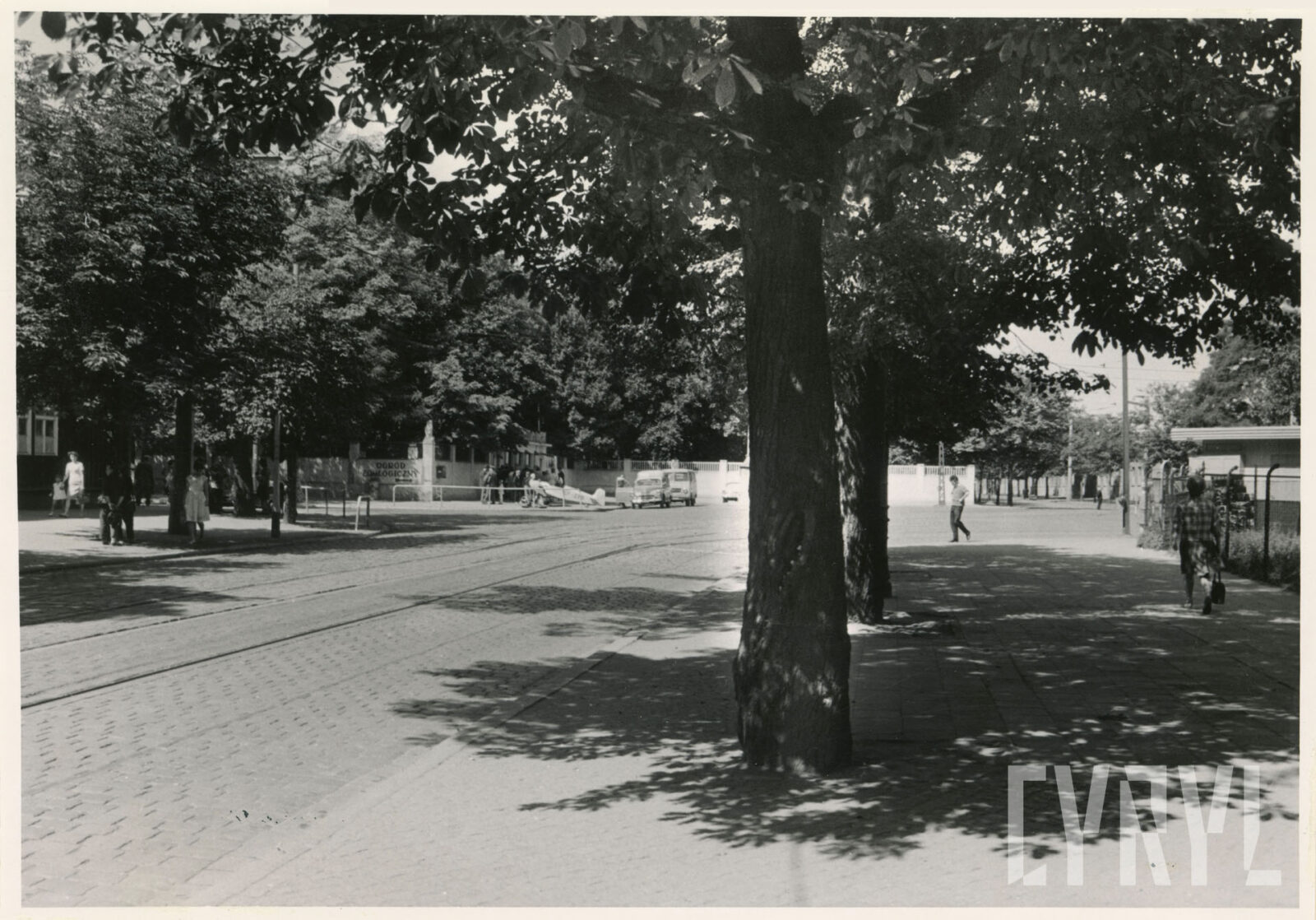 Ulica Zwierzyniecka, od lewej ogrodzenie ogrodu Zoologicznego, dalej szachulcowy budynek dawnego dworca kolejowego z 1848 roku na Jeżycach (Kolei Stargardzkiej; nie istnieje)