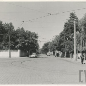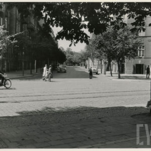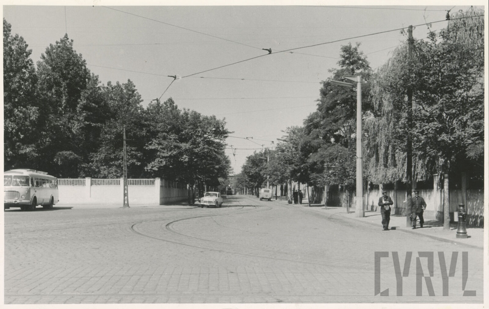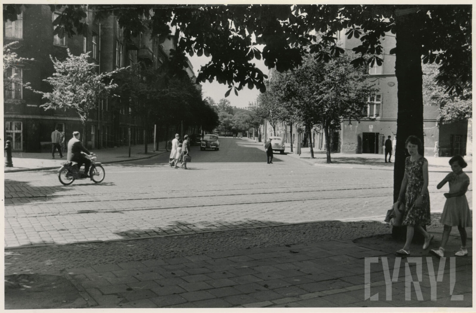 Ulica Kraszewskiego na skrzyżowaniu z ul. Zwierzyniecką na Jeżycach, w głębi zabudowania Zakładów Przemysłu Odzieżowego im. Komuny Paryskiej Modena