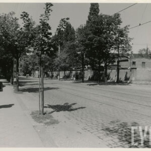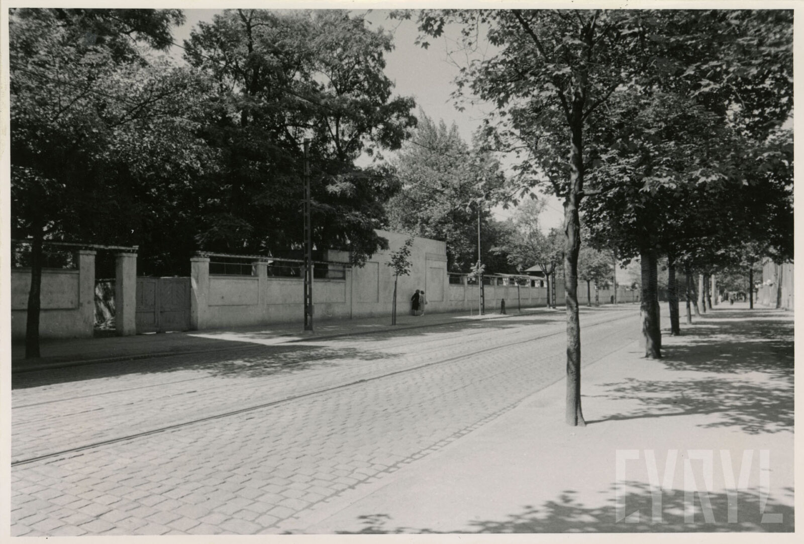 Ulica Zwierzyniecka, po lewej ogrodzenie zajezdni tramwajowej, po prawej ogrodzenie Ogrodu Zoologicznego