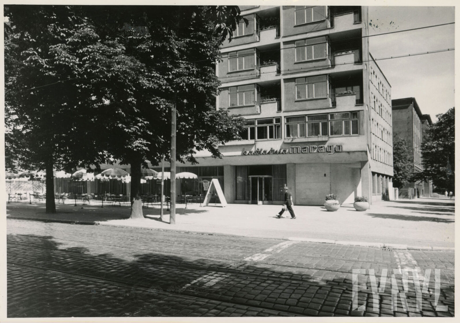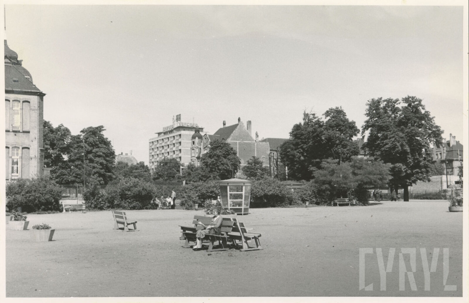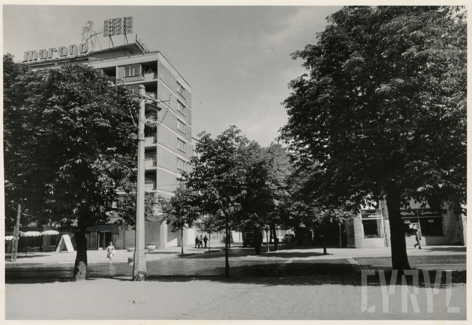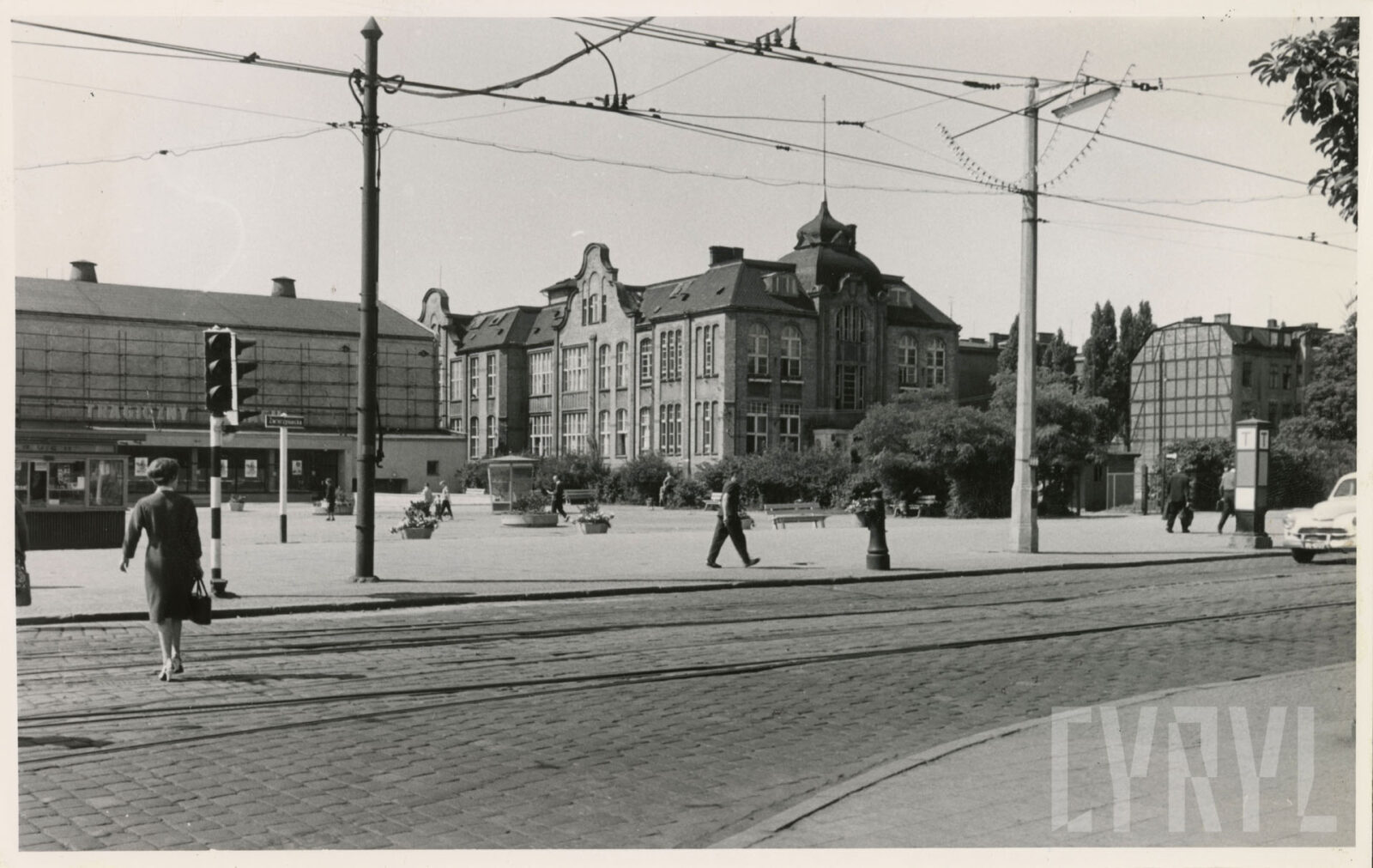 Kino Bałtyk (z lewej) i drukarnia Concordia (dzisiaj Concordia design) na skrzyżowaniu ulic Roosevelta i Zwierzynieckiej (dzisiaj rondo Kaponiera)07.1962