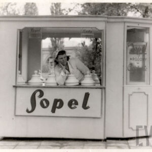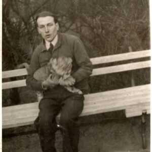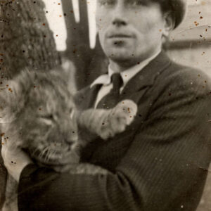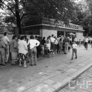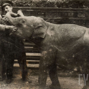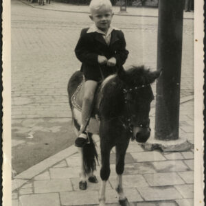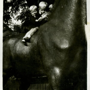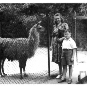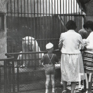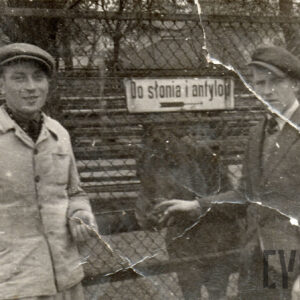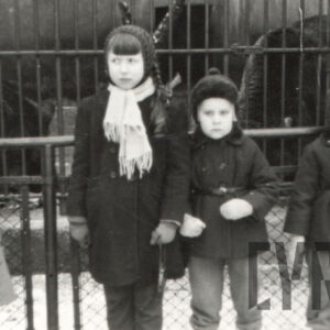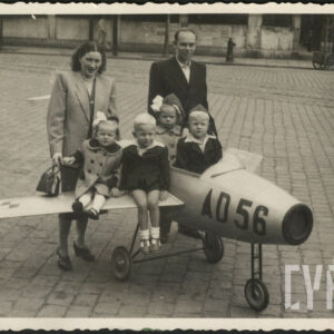 Gabryś (siedzi na skrzydle) i Damian, synowie Mieczysława Giełdy, na spacerze z ciotką, wujem i kuzynkami, w głębi ogrodzenie ogrodu zoologicznego przy ul. Zwierzynieckiej (dzisiaj Stare Zoo)09.1958