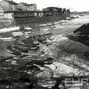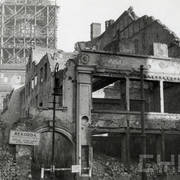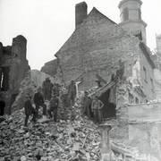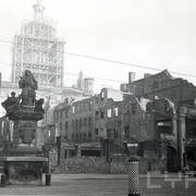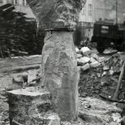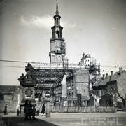 Rozbiórka kamienic południowego bloku śródrynkowego zniszczonych w wyniku działań wojennych, w oddali odbudowa wieży ratusza, na pierwszym planie figura św. Jana Nepomucena11.01.1949