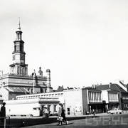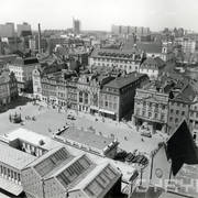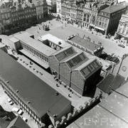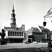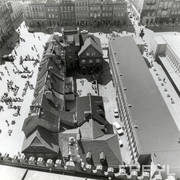 Widok z wieży ratuszowej na zabudowę śródrynkową z domkami budniczymi i Wielkopolskim Muzeum Wojskowym pobudowanym na miejscu dawnych sukiennic (z prawej)07.1980