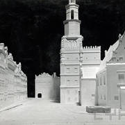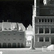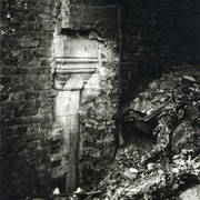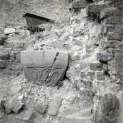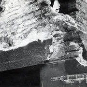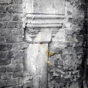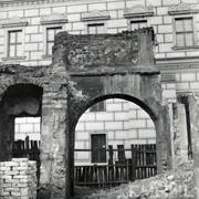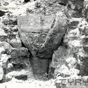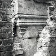 Konsola kamienna profilowana na wysokości pierwszego piętra i wspierające się na niej dwie arkadki na ścianie południowej domku budniczego nr 11 na Starym Rynku odkryte w czasie badań architektonicznych po zniszczeniach wojennych28.08.1949