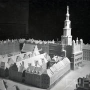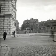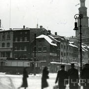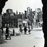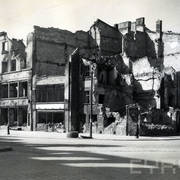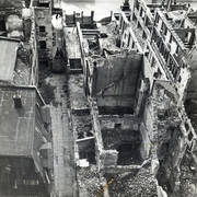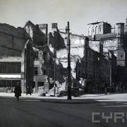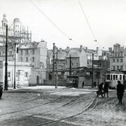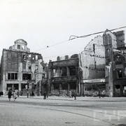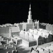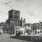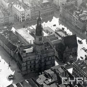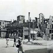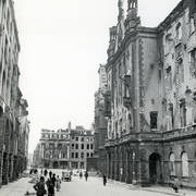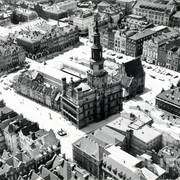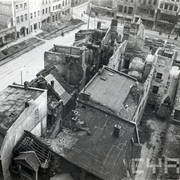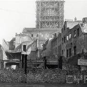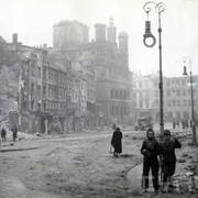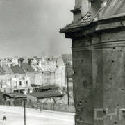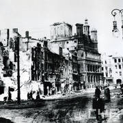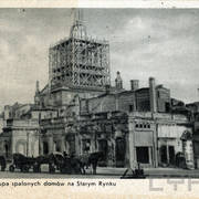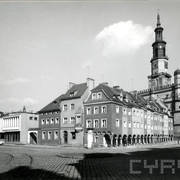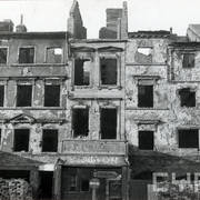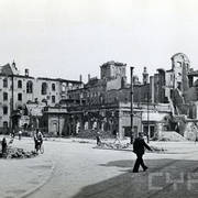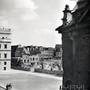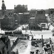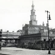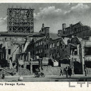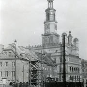 Wewnętrzna zabudowa Starego Rynku od strony południowo-zachodniej, z lewej rusztowania na elewacji ratusza w czasie odbudowy po zniszczeniach wojennych1953