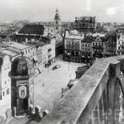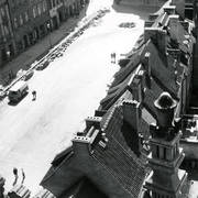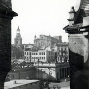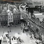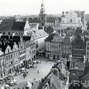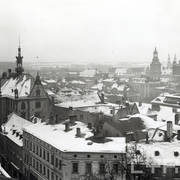 Widok z wieży ratuszowej na fragmenty wschodniej i południowej pierzei Starego Rynku, widoczna wieża dawnego kolegium jezuickiego i fara, w oddali wieże kościoła Bernardynów1926