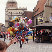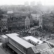 Widok z wieży ratuszowej na fragmenty wschodniej i południowej pierzei Starego Rynku w czasie Jarmarku Świętojańskiego, w tle wieża dawnego kolegium jezuickiego i fara06.1976