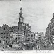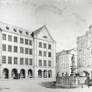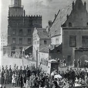 Fragment Starego Rynku z ratuszem, budynkiem wagi miejskiej, kamienicami północnej pierzei i studzienką od strony zachodniej, litografia kolorowa Karola Antoniego Simona z lat 1830-38