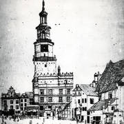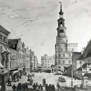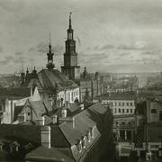 Widok z zamku Przemysła w stronę Starego Rynku, widoczny ratusz i pruski Nowy Ratusz, z prawej wieża dawnego kolegium jezuickiego i fara, w oddali wieże kościoła Bernardynów, przed 1932 rokiem