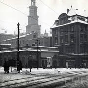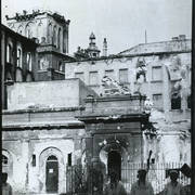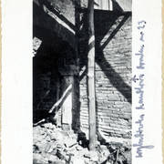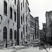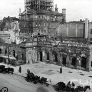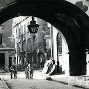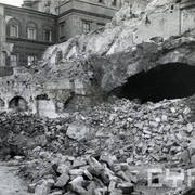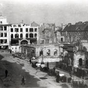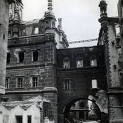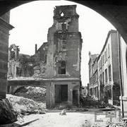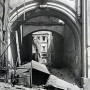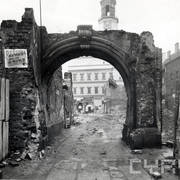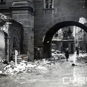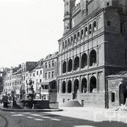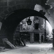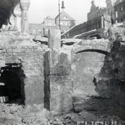 Przejście pod łącznikiem między ratuszem (z lewej) a pruskim Nowym Ratuszem na Starym Rynku po zniszczeniach wojennych, przy ratuszu studzienka Bamberki1945