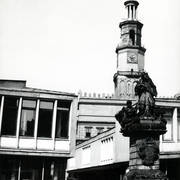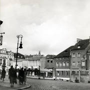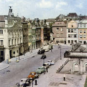 Zabudowa śródrynkowa od strony ul. Wrocławskiej z rzeźbą św. Jana Nepomucena, nowo powstałymi modernistycznymi budynkami i kamieniczkami z dawną kancelarią miejską, około 1965 roku