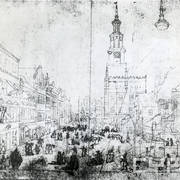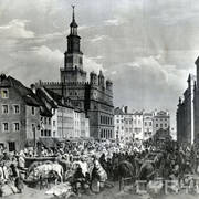 Stary Rynek i ratusz w dniu targowym, litografia W. Kurnatowskiego według rysunku W. Baeselera, lata 1841-1846 (różni się szczegółami od CYRYL_18_16_0_6_0005)