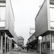 Ulica Kurzanoga na tyłach domków budniczych na Starym Rynku, z lewej modernistyczny budynek Wielkopolskiego Muzeum Wojskowego pobudowany na miejscu dawnych sukiennic, około 1969 roku