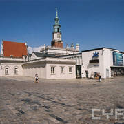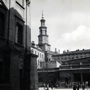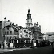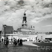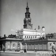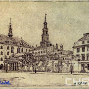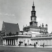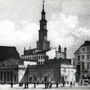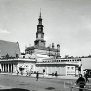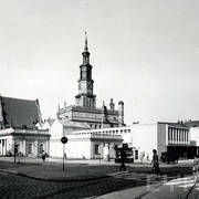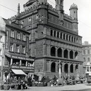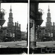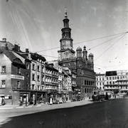 Fragment zabudowy śródrynkowej z widoczną wieżą ratusza i Odwachem od strony ul. Franciszkańskiej, z lewej fragment elewacji Pałacu Działyńskich, przed 1945 rokiem