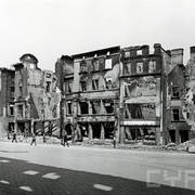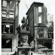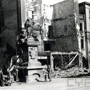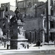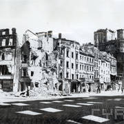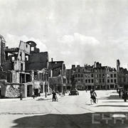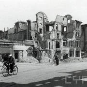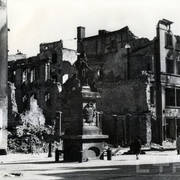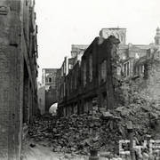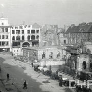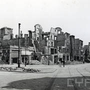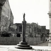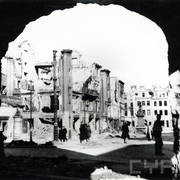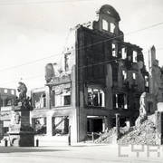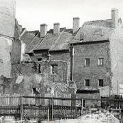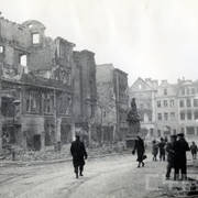 Wewnętrzna zabudowa Starego Rynku przy ul. Wiankowej (obecnie ul. Jana Baptysty Quadro) zniszczona w czasie II wojny światowej, w oddali figura św. Jana Nepomucena od tyłu07.07.1945