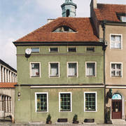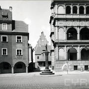Konsola kamienna na wysokości pierwszego piętra i wspierająca się na niej arkadka (nad nadprożem) na ścianie południowej domku budniczego nr 11 na Starym Rynku odkryte w czasie badań architektonicznych po zniszczeniach wojennych1949