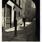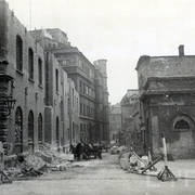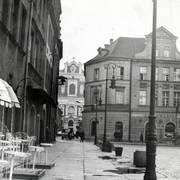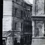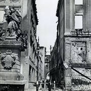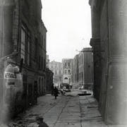 Ulica Wiankowa (obecnie ul. Jana Baptysty Quadro) w wewnętrznej zabudowie Starego Rynku po zniszczeniach wojennych, z lewej figura św. Jana Nepomucena1945