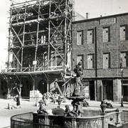 Odbudowa kamienicy z Czerwoną Apteką we wschodniej pierzei Starego Rynku po zniszczeniach wojennych, na pierwszym planie fontanna Prozerpiny07.1948–08.1948