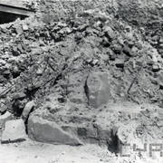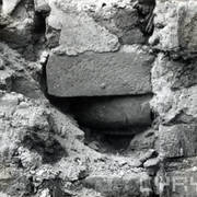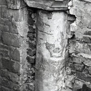 Kolumienka w murze grodziżarowym między domkami nr 24 i 25 na Starym Rynku odkryta w czasie prac archeologiczno-architektonicznych prowadzonych po zniszczeniach wojennych07.1950–08.1950